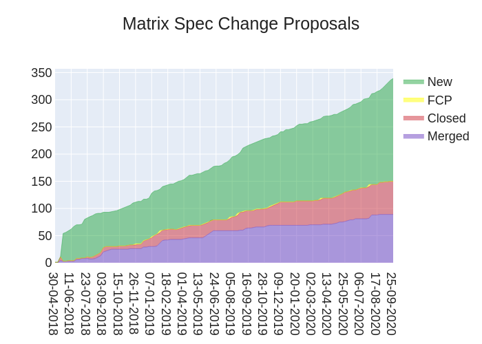 There are currently 136 open MSCs that have yet to undergo Final Comment Period (FCP), 75 of which are marked as proposal-in-review, and 20 that have a FCP proposed. Relative to the 65 MSCs that have ever been closed, this is a lot of outstanding ideas, features and maintenance changes.