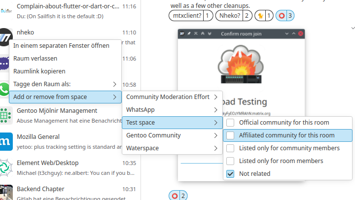 Similarly you can now somewhat edit what rooms are in a space. I grew up with Windows 98, so this is a very nested right click menu. We are still discussing some of the wording choices for the options there, so if you have any opinions about it, feel free to give feedback about it! This is part of the bigger goal to be able to manage your communities from within Nheko, so stay tuned for more features coming in that area.