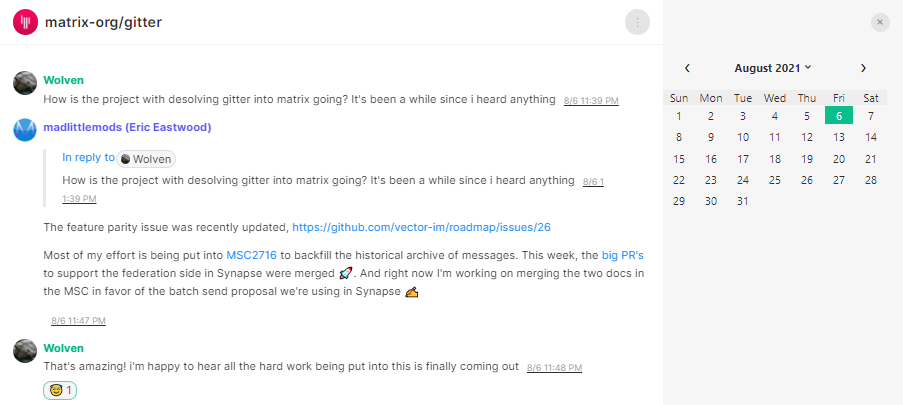 While we announce what MSCs we're focusing on during a given week during TWIM, it's not as clear which items we're looking to pull from the backlog next. To help tackle this, and to help keep us honest, we've begun putting each MSC into either "feature", "maintenance", or "core" buckets. This materialises in the form of github tags, which can be used to filter the list of MSCs like so: feature, maintenance, core. For a given timespan, we’ll pick a track and pull MSCs out of that category when possible. More information about MSC categories are now detailed on the proposals page.