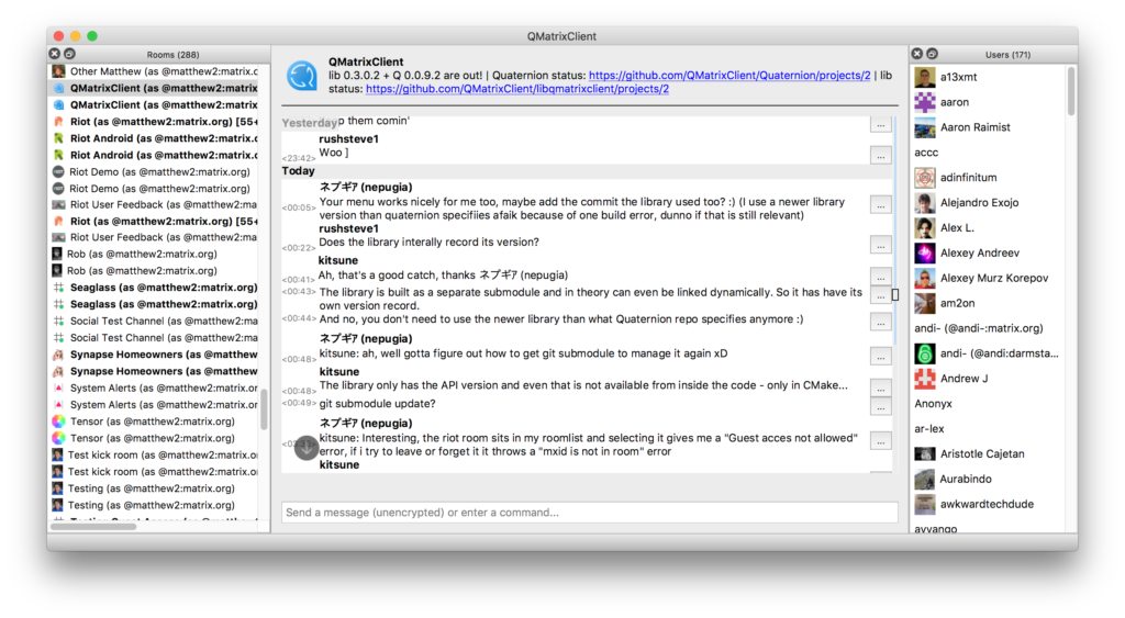 We'd also like to welcome mujx (developer of nheko) and kitsune (developer of Quaternion and libQMatrixClient) to the new core team as we start trialling the new governance structure (which mainly amounts at this point to getting review approvals on spec proposals and changes from the relevant domain experts on the new team). This brings us to a full complement for the team: Erik (servers), richvdh (servers, crypto & clients), Dave (clients & push/identity) and uhoreg (crypto, general) from the current core team; and Anoa (servers, AS API), TravisR (integrations, AS API; acting with Dimension hat on), mujx & kitsune from the community.