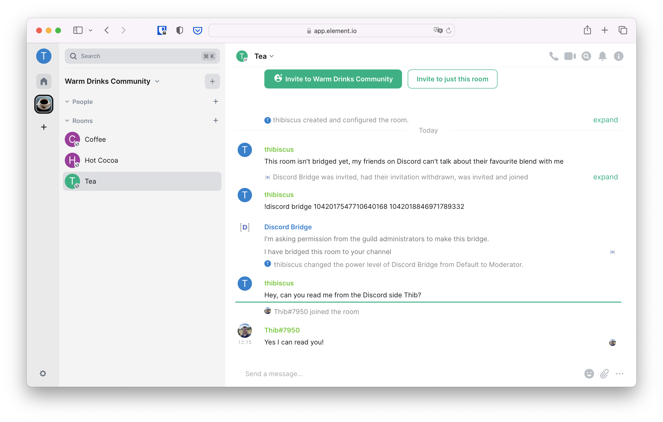 Here you can see a bridged room from the Matrix and the Discord perspective.